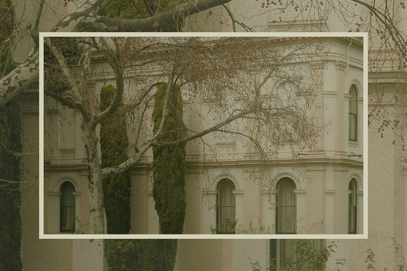 The elegant arches of a Melbourne Victorian building are framed by a leafless tree and evergreen cypress, set against a soft, muted ecru background.